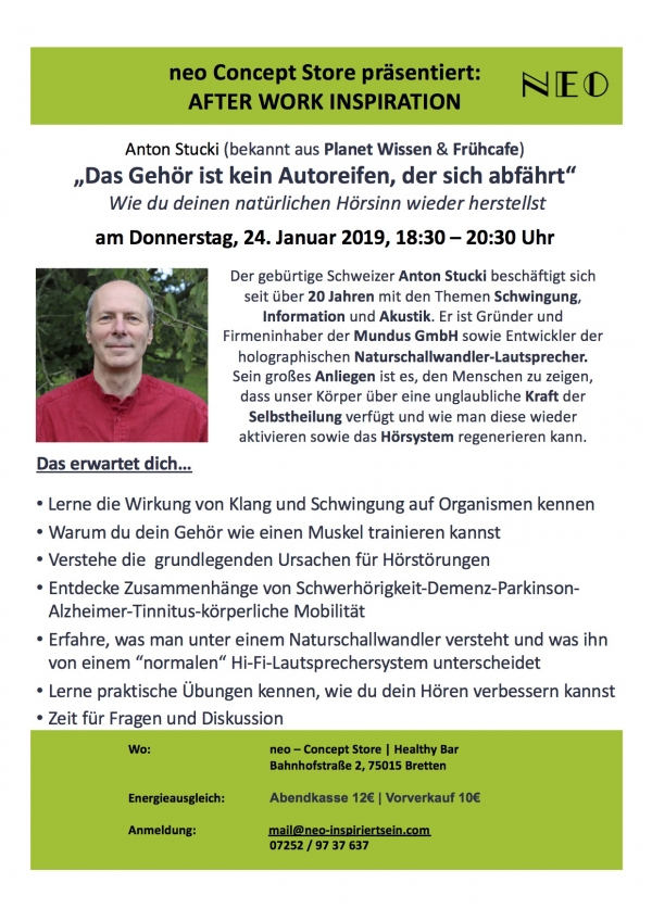 Der gebürtige Schweizer Anton Stucki beschäftigt sich seit über 20 Jahren mit den Themen Schwingung, Information und Akustik. Er ist Gründer und Firmeninhaber der Mundus GmbH sowie Entwickler der holographischen Naturschallwandler-Lautsprecher. Sein großes Anliegen ist es, den Menschen zu zeigen, dass unser Körper über eine unglaubliche Kraft der Selbstheilung verfügt und wie man diese wieder aktivieren sowie das Hörsystem regenerieren kann.